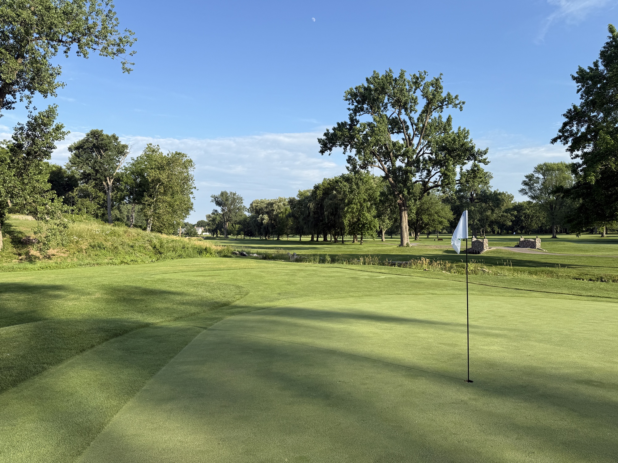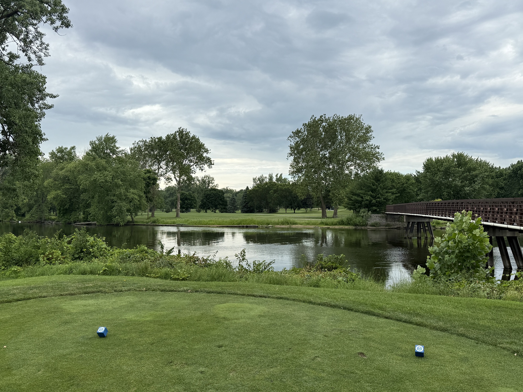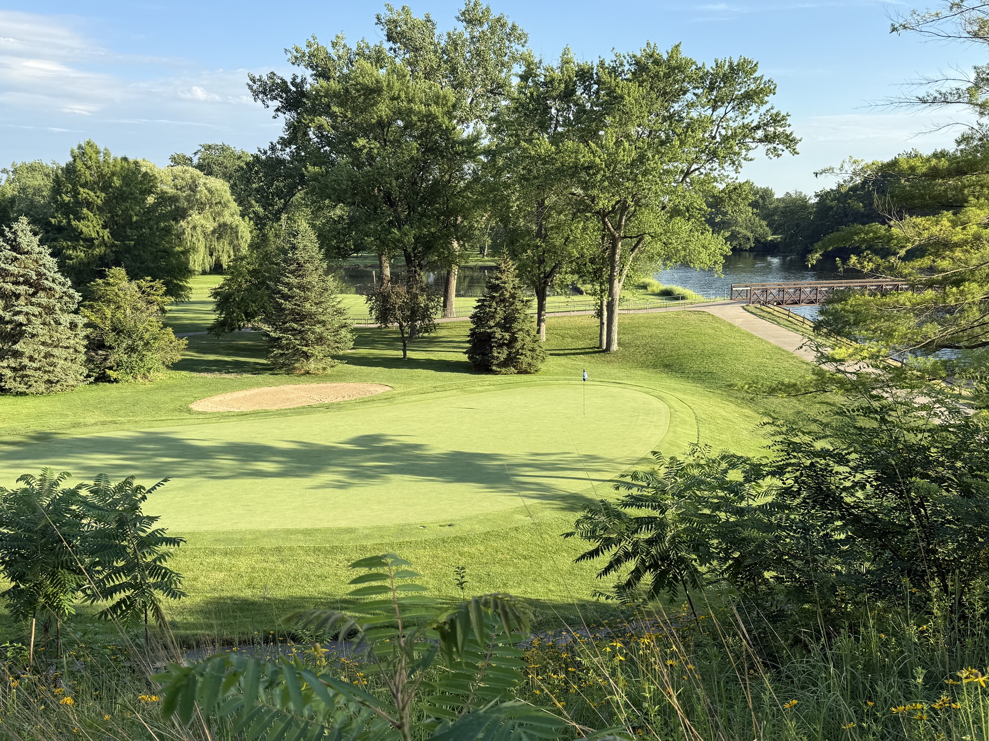 The front is longer and more in line with what would be found at a regulation length course. The 1st and the 3rd are par-5’s that play 560+ yards. The 3rd is one of the holes that plays over the river and has an awkward angle to get into the fairway. Tough.