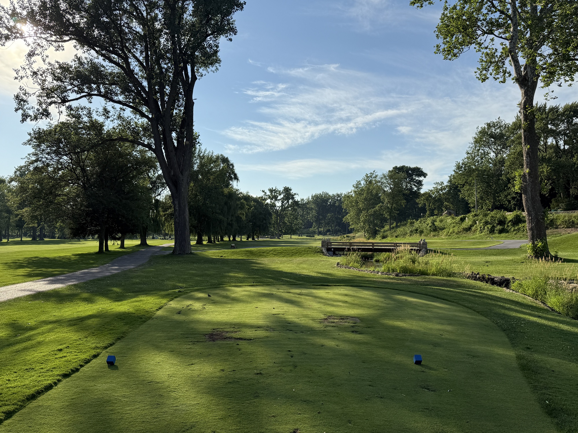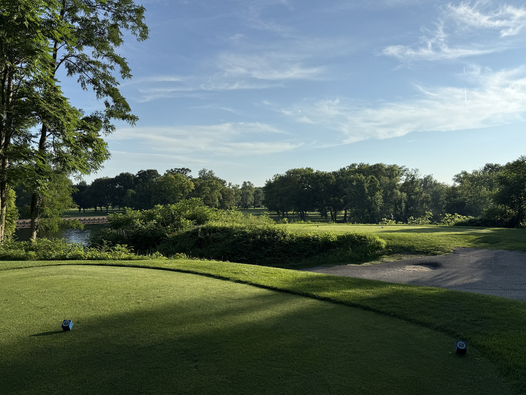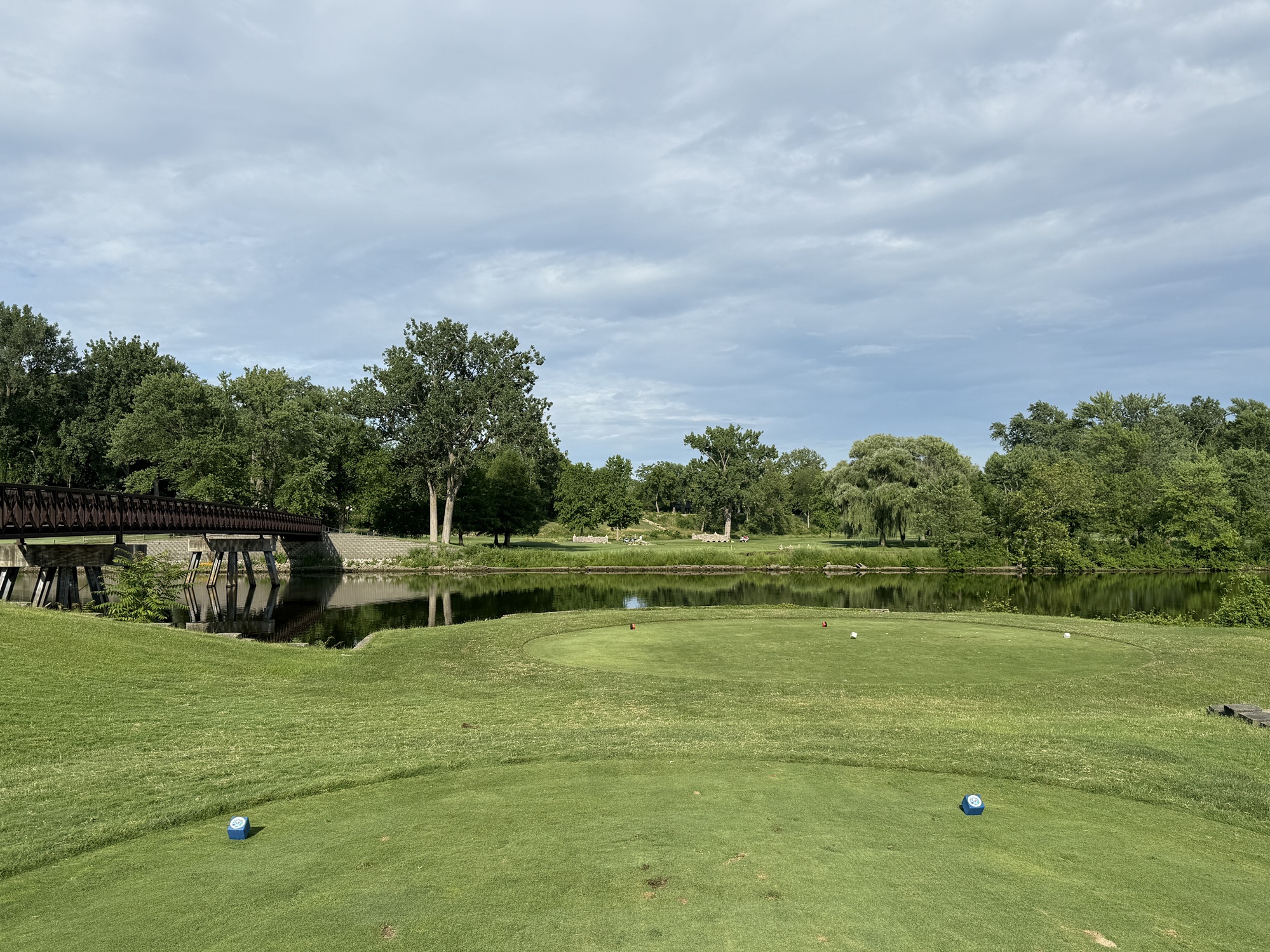 The front is longer and more in line with what would be found at a regulation length course. The 1st and the 3rd are par-5’s that play 560+ yards. The 3rd is one of the holes that plays over the river and has an awkward angle to get into the fairway. Tough.