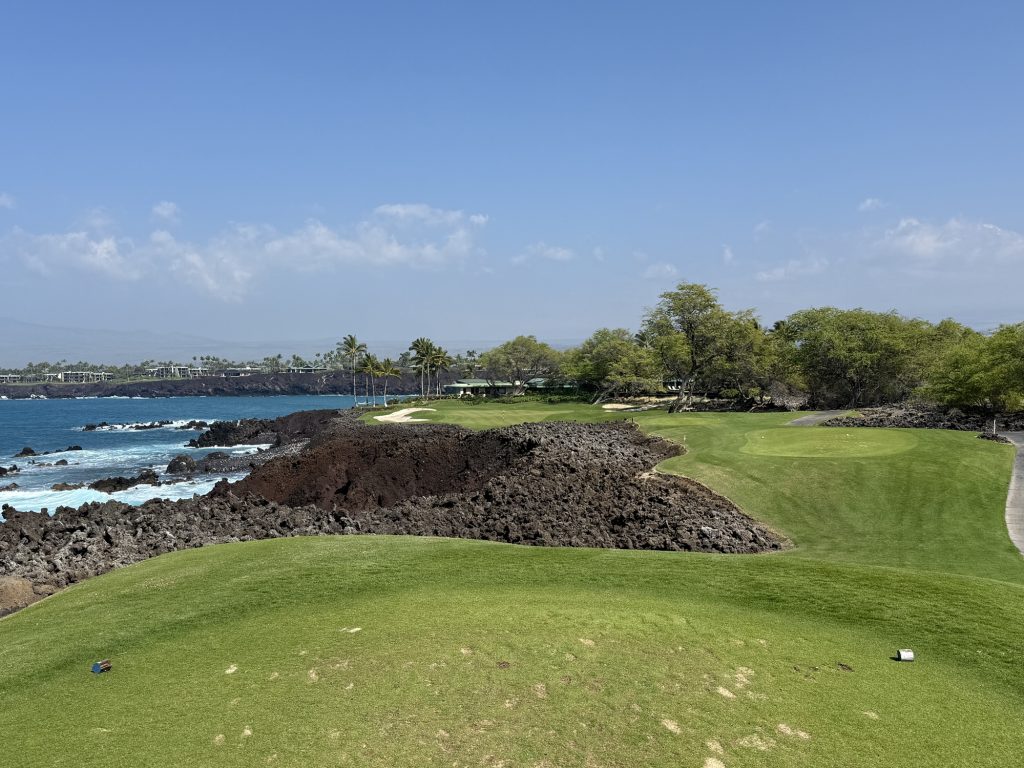 The course opens with some inland holes before getting to the par-3 7th, one of the signature holes. The 7th – 201 yards from the blue tees – plays across the edge of the ocean and showcases Hawaii’s dramatic coastline. The green is large and there is a bailout area to the right, but it is still an intimating shot.