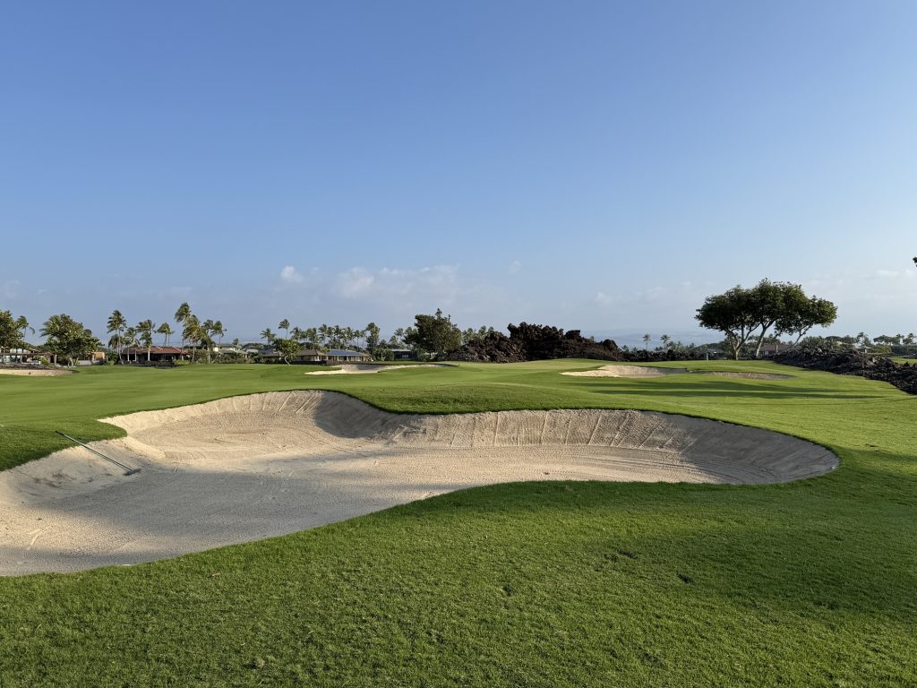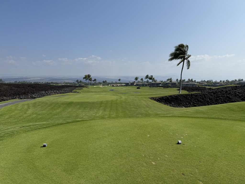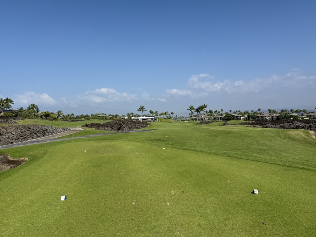 The blue tees on the South course are 71.4/125/6453. From a difficulty standpoint, I’d say the course is very fair. It has a resort course feel. There are spots to lose balls (water hazards, the lava, and the ocean) but the fairways and greens are generous. Generally speaking, only terrible shots are punished. There are many large bunkers to catch shots in the wind – so those added some difficulty.