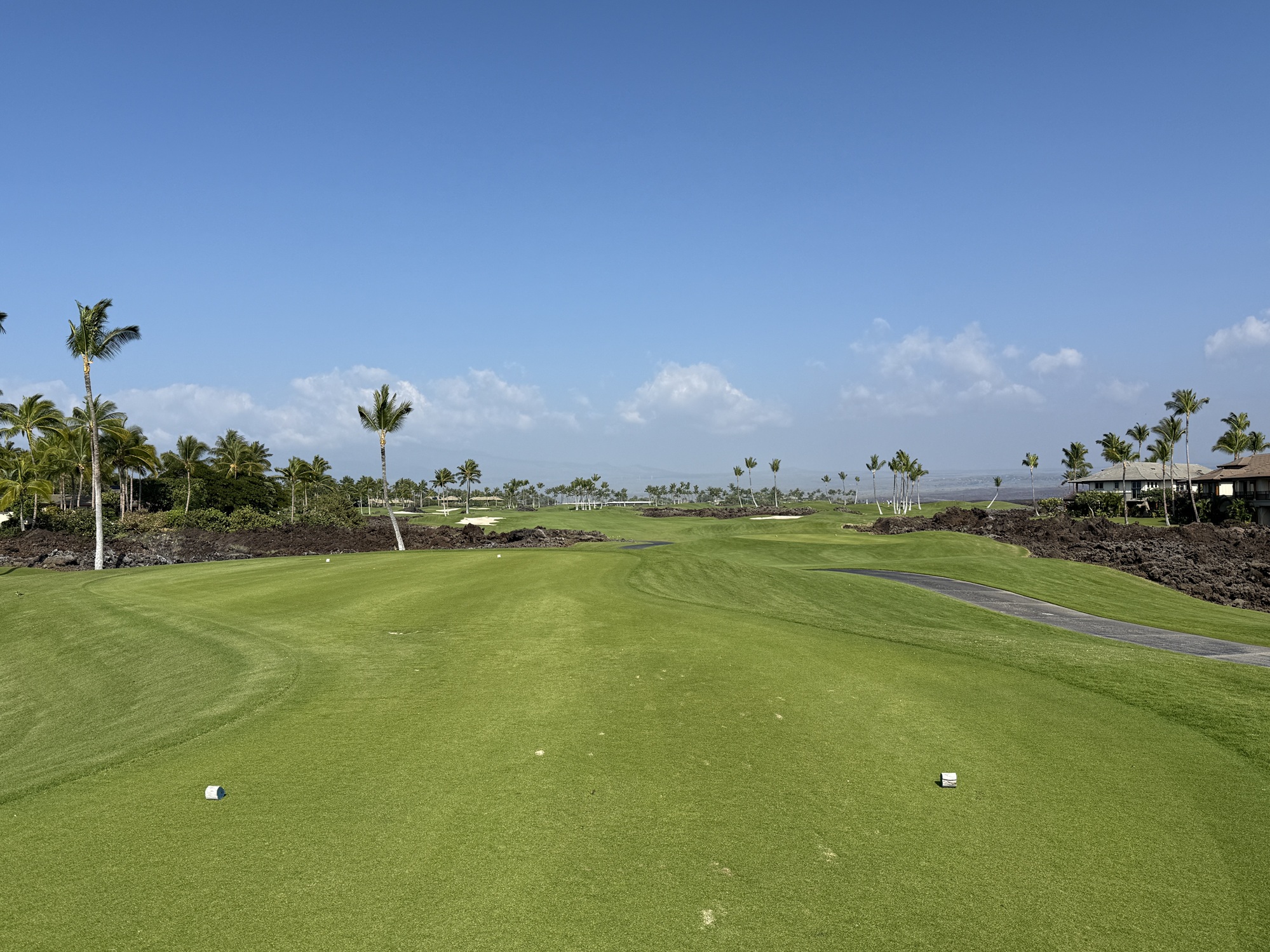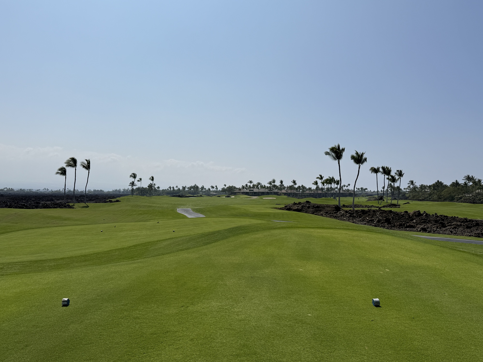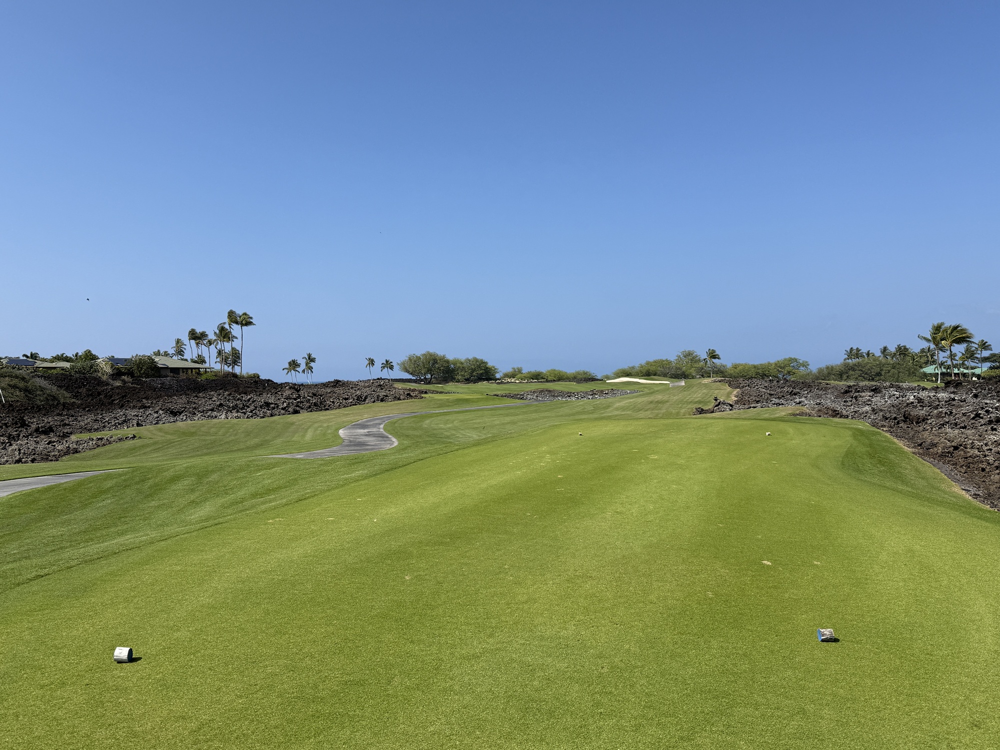 The blue tees on the South course are 71.4/125/6453. From a difficulty standpoint, I’d say the course is very fair. It has a resort course feel. There are spots to lose balls (water hazards, the lava, and the ocean) but the fairways and greens are generous. Generally speaking, only terrible shots are punished. There are many large bunkers to catch shots in the wind – so those added some difficulty.