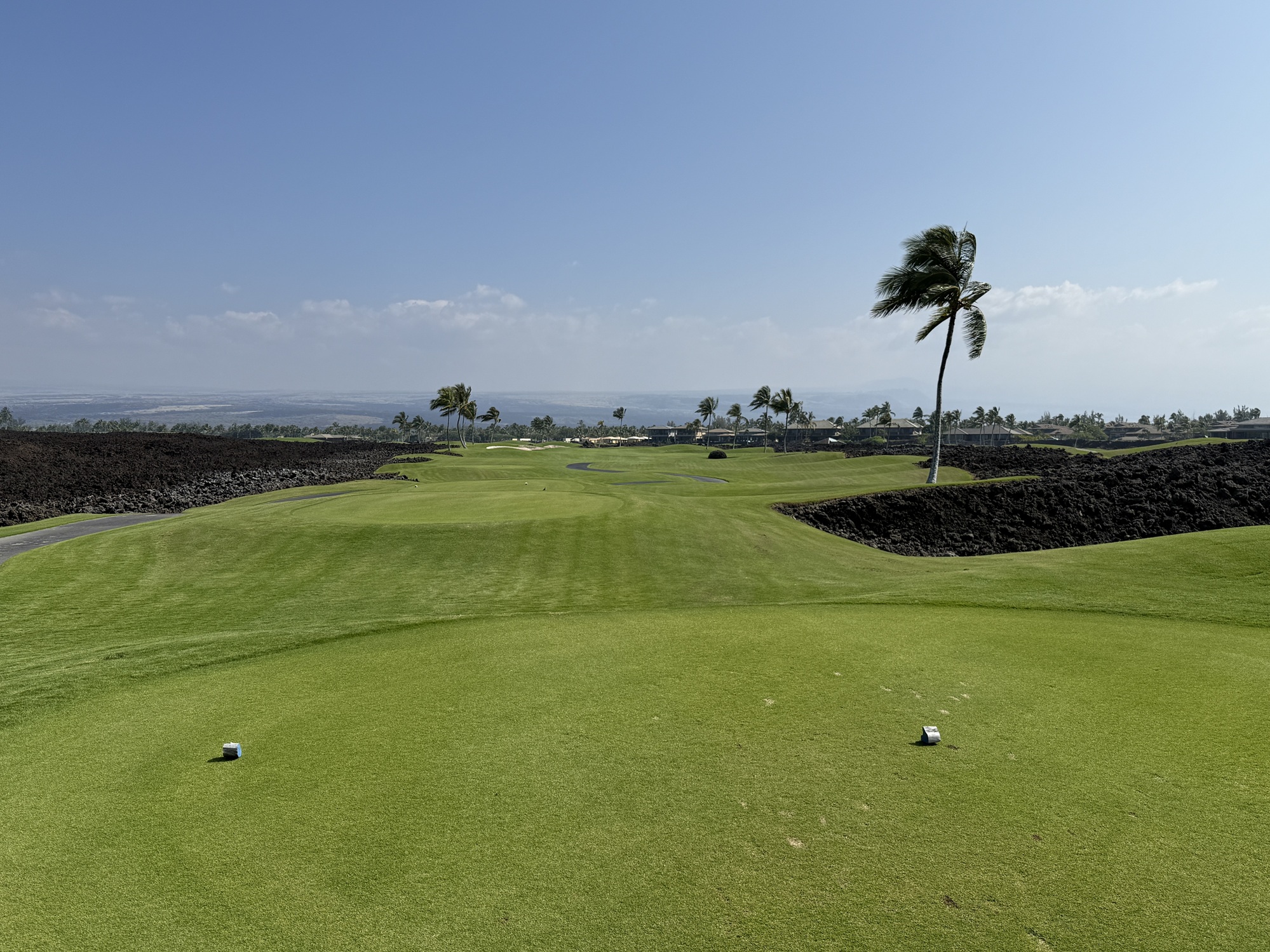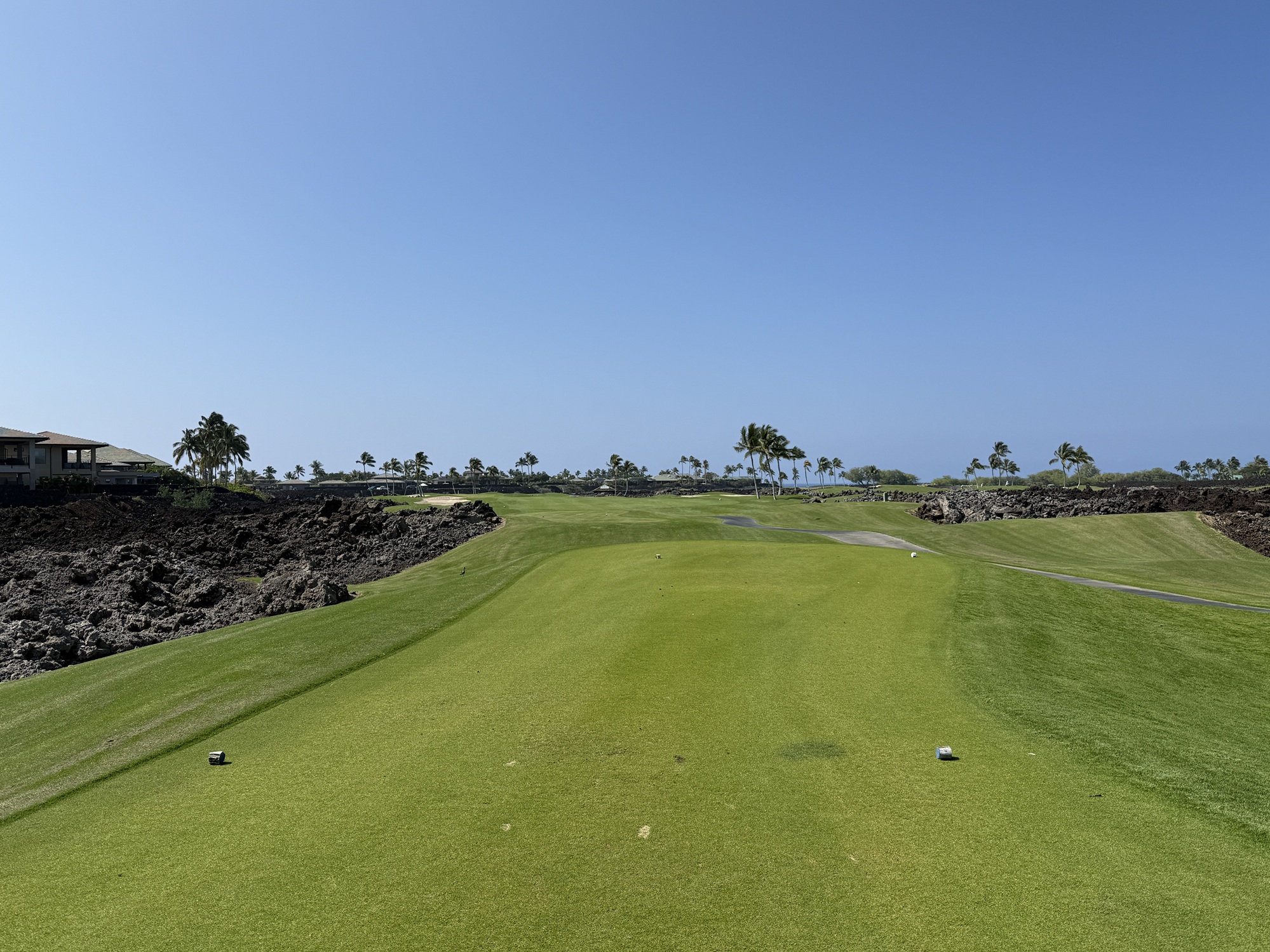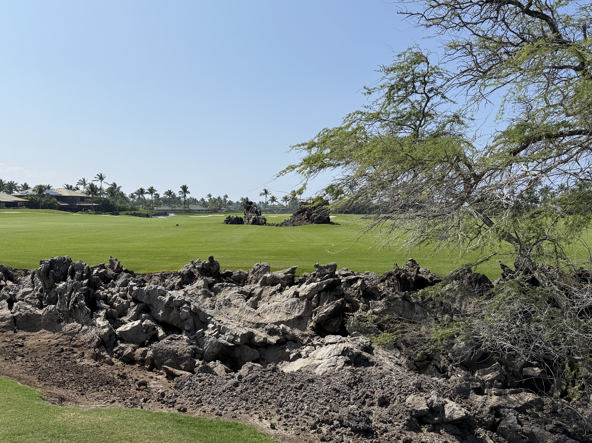 The blue tees on the South course are 71.4/125/6453. From a difficulty standpoint, I’d say the course is very fair. It has a resort course feel. There are spots to lose balls (water hazards, the lava, and the ocean) but the fairways and greens are generous. Generally speaking, only terrible shots are punished. There are many large bunkers to catch shots in the wind – so those added some difficulty.