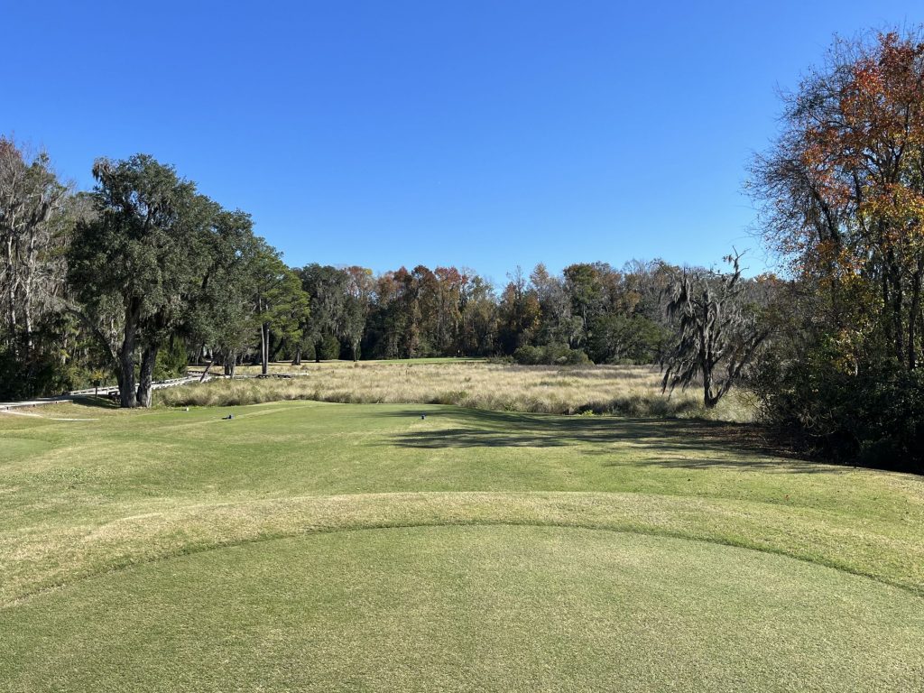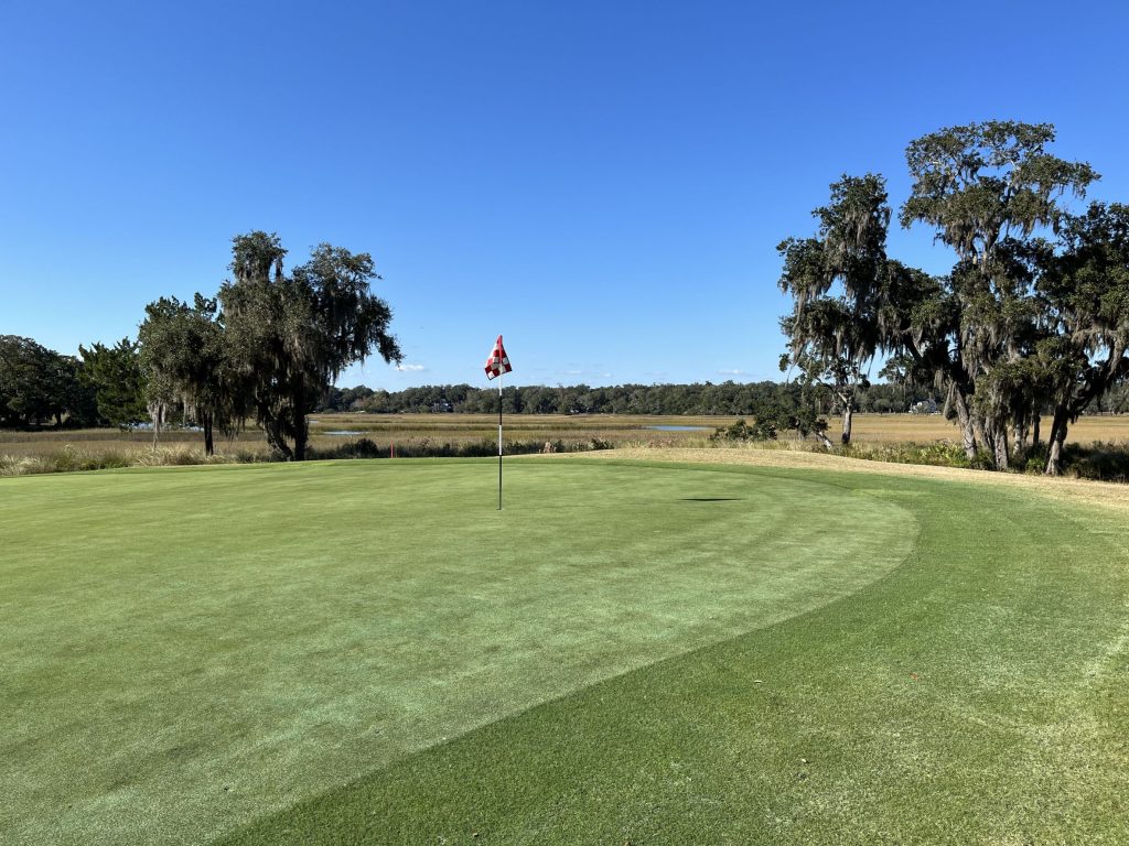 The 9th, a 542 yard par-5, is one of the course’s quirky holes with a long carry to the fairway and then an awkward layup. The fairway narrows with the marsh and oak trees pinching where you want to land the layup. The 18th is a reachable par-5 with another carry over the marsh.